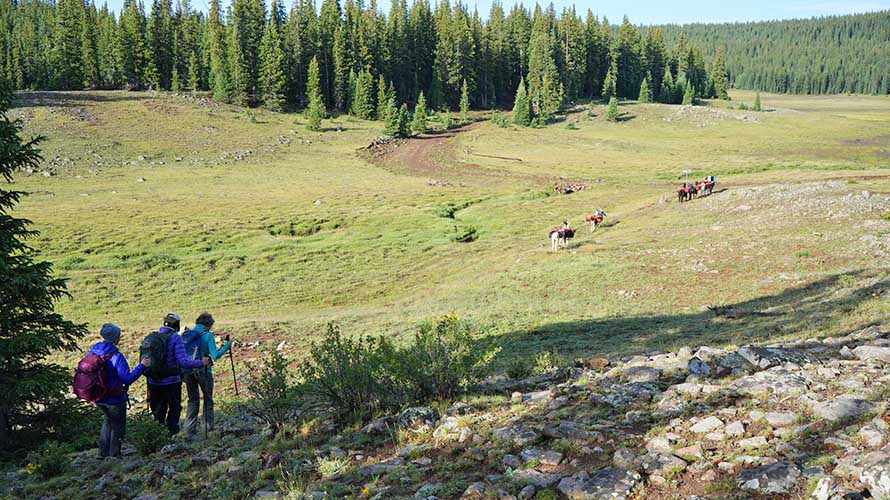 This Utah llama trek heads up into the mountains that tower above Capitol Reef National Park and the Grand Staircase-Escalante National Monument. An amazing summer alternative to the hotter, drier canyon country of the lower elevations, this trip is a fantastic mountain excursion into pine-forested peaks, trout lakes, meadows, wildflowers and wildlife. We follow old cattle trails into the mountains where we earn breathtaking views of the Henry Mountains, Capitol Reef and the Grand Staircase. We will set up camp not far from the shore of a pristine lake and spend 1 or 2 days exploring these remote and beautiful mountains. The highlight of the trip is a traverse of the “highline” section of the Boulder Rim, which takes us across basalt outcroppings for an unforgettable high country experience!